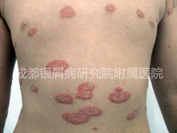 病史:患者全身出现皮损伴有鳞屑,发烧诱发。曾在当地治疗,口服治疗银屑病的药,因发烧输了消炎药,疗效不明显,今来我院治疗。