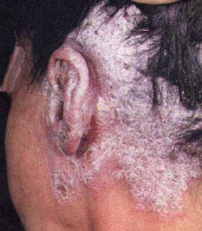头部牛皮癣患者皮肤坏损常发生于发际,呈带状,有时侯融合成片,布满整个头皮,鳞屑也比较厚,皮损处毛发与厚积的鳞屑干燥紧缩在一起形成束状, 形状就如毛笔头。如果头部牛皮癣患者的这种情况没有得到及时的治疗,会引起更为严重的后果,皮损很可能可扩展至前发际处,侵蚀到前额数厘米。牛皮癣若处于急性进行期,牛皮癣患者全身皮损严重时,患者颜面也会出现部分皮损,其症状大多呈点滴状或指甲大小的红色丘疹,如果发生在手心、足心部位者,常发生明显的角化斑片,中央厚而边缘薄,斑上可有白色鳞屑或点状凹陷,有时因皮损较厚而引起条状皮肤裂隙